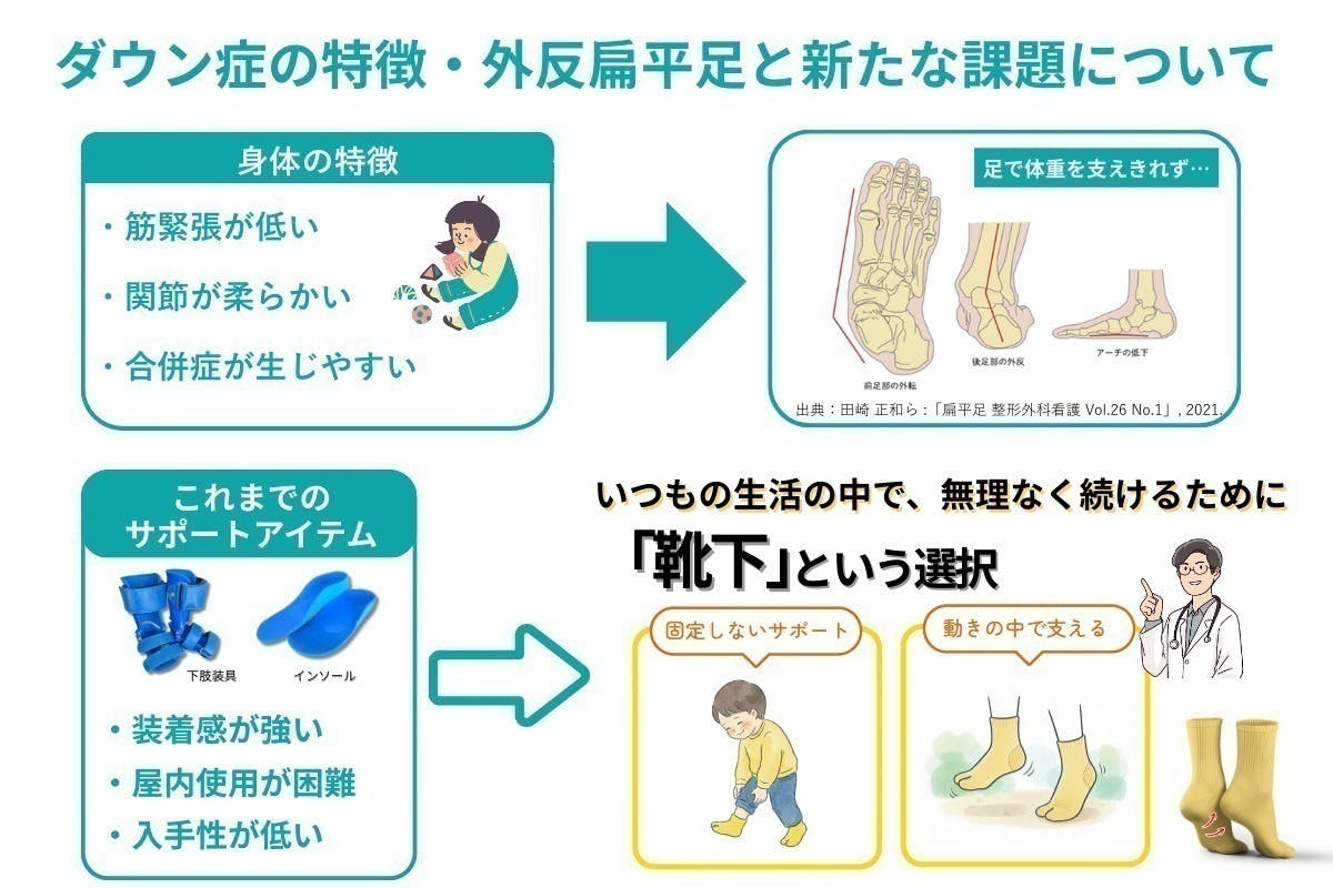 本プロジェクトでは、ダウン症の幼児が日常生活で取り入れやすいケアソックスを提供することを目指しています。