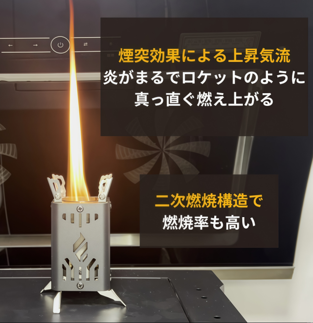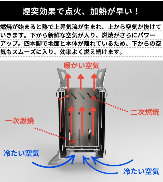 煙突効果と二次燃焼により、少ない燃料でも高火力を発揮します。