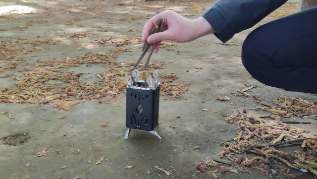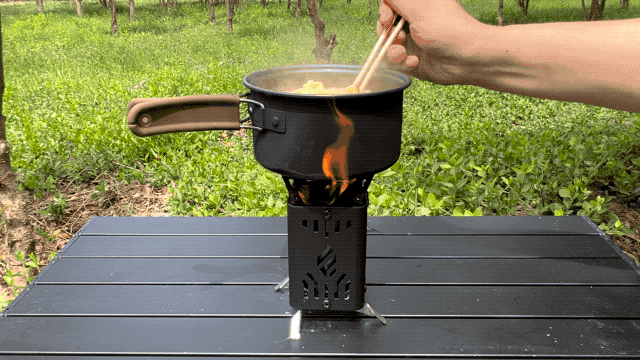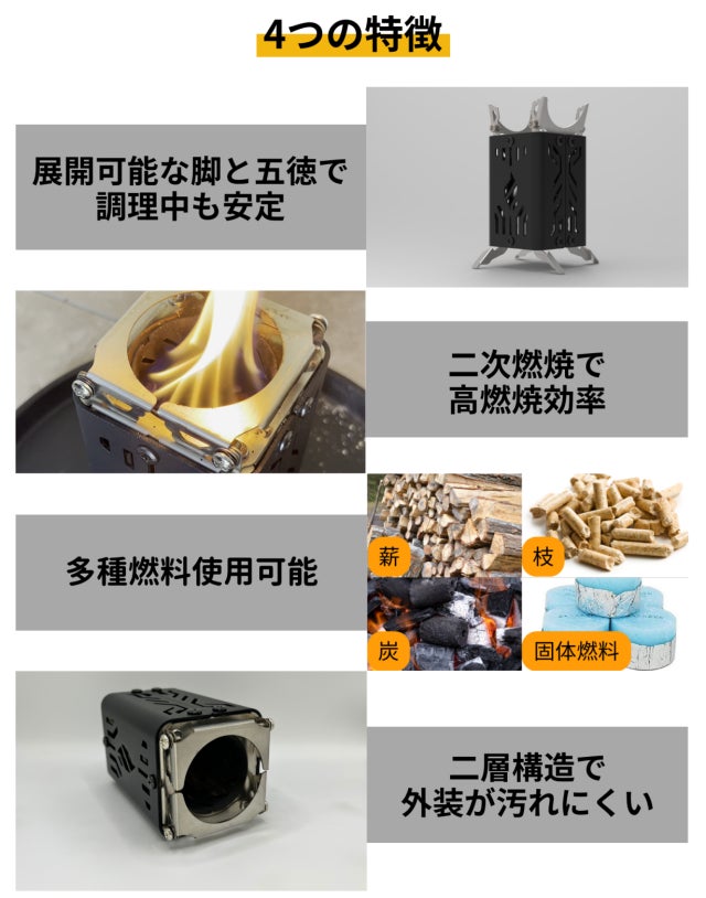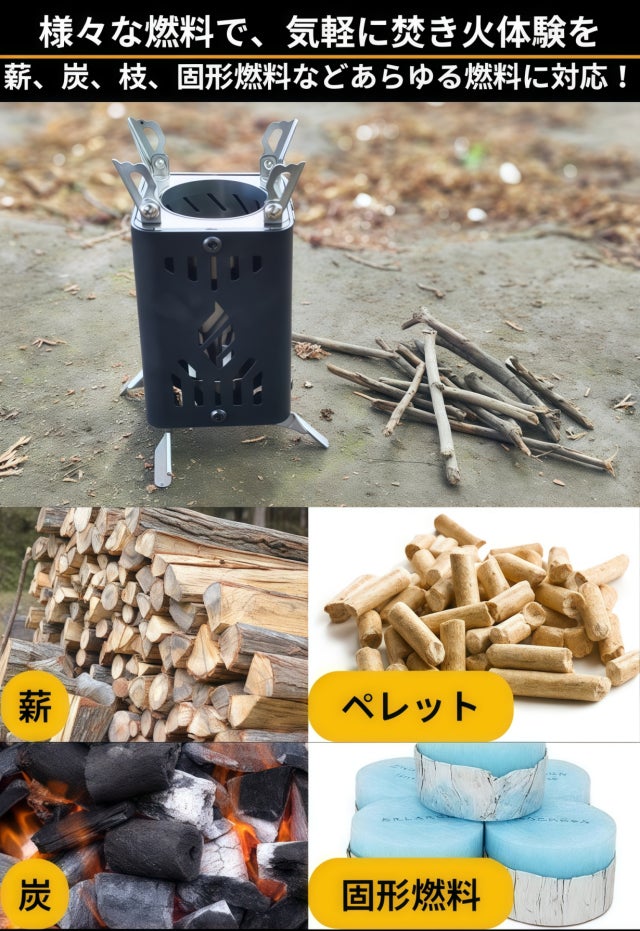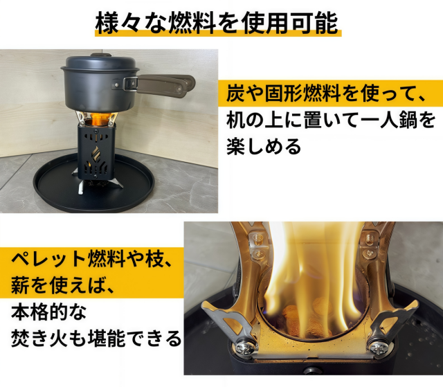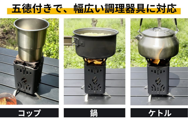 現地で調達できる枝や枯葉を燃料に、お湯を沸かしたり、肉を焼いたり、暖を取ることに加え、撤収も容易なため、アウトドアの現場で活躍します。