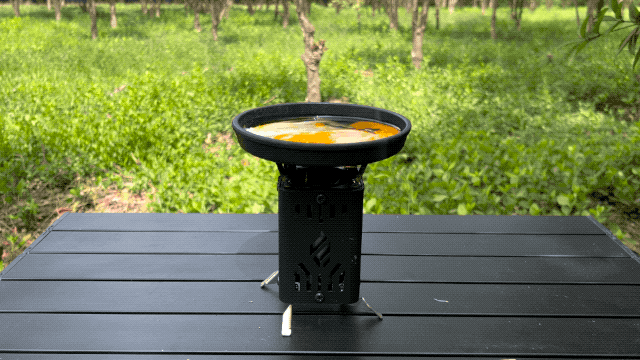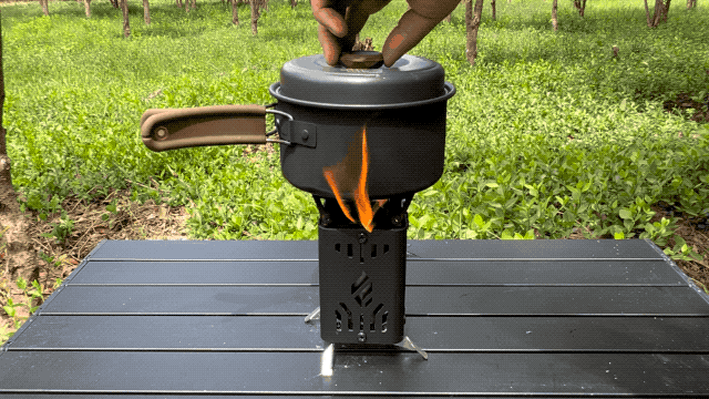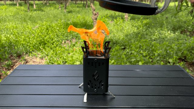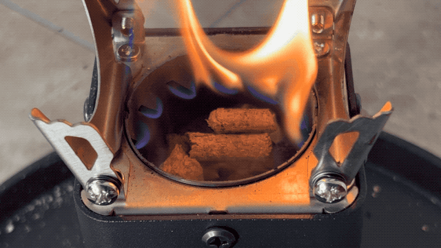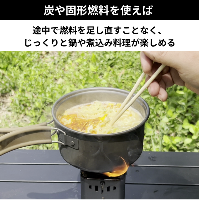 調理器具を持ち上げて燃料室に燃料を追加できない場合でも、炭や固形燃料を使用することで、より長く安定した炎を維持できます。
