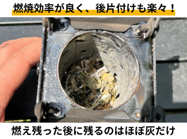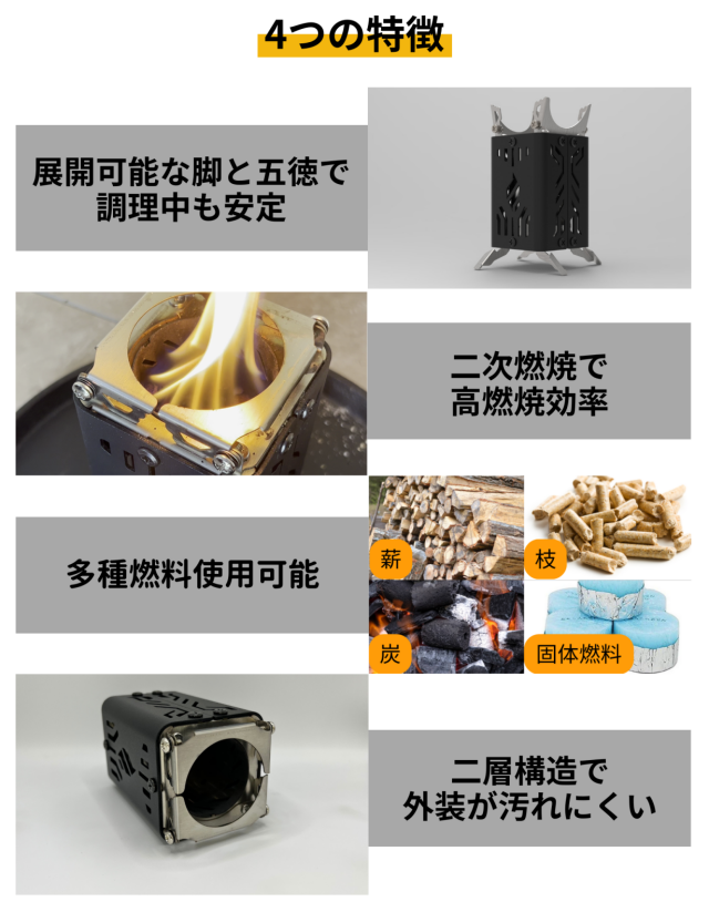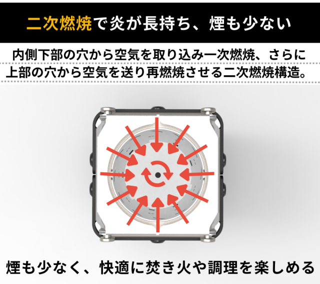 燃焼室は円形構造を採用しており、「煙突効果」により、少ない燃料や木の枝でもしっかりとした火力を発揮します。