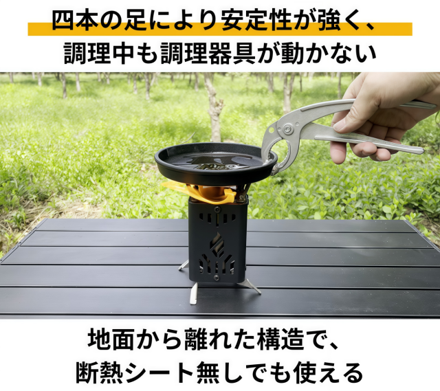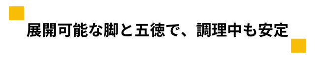 展開式の脚と五徳付きで、調理器具を安定して置けます。