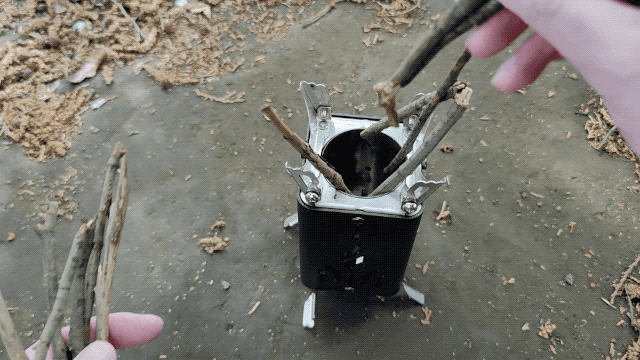 かさばる薪を持って行くことなく、現地で拾った小枝であっという間にたき火をすることができます。