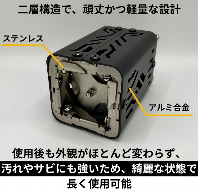 「Fire Beast9」は二層構造で作られており、頑丈で、ススなどで汚れにくい構造になっています。