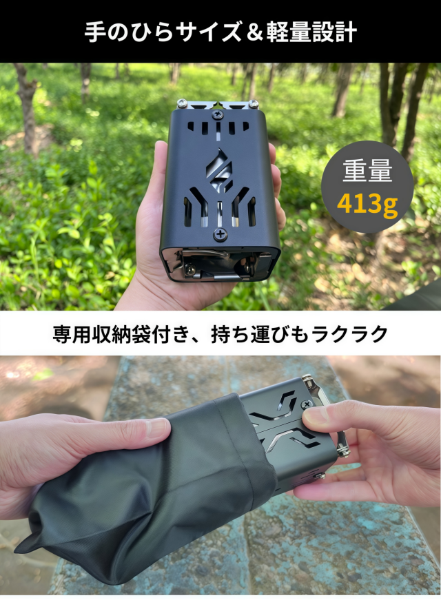 手のひらサイズながら、本格的な焚き火機能を備え、気軽に楽しめる中にも遊び心をくすぐる一台です。