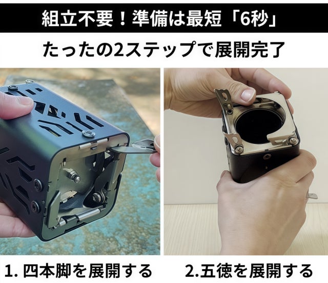 A:一体型で組み立てが不要な構造になっております。最短「6秒」で脚や五徳を展開して設置できます。コンパクトサイズで、持ち運びも便利です。