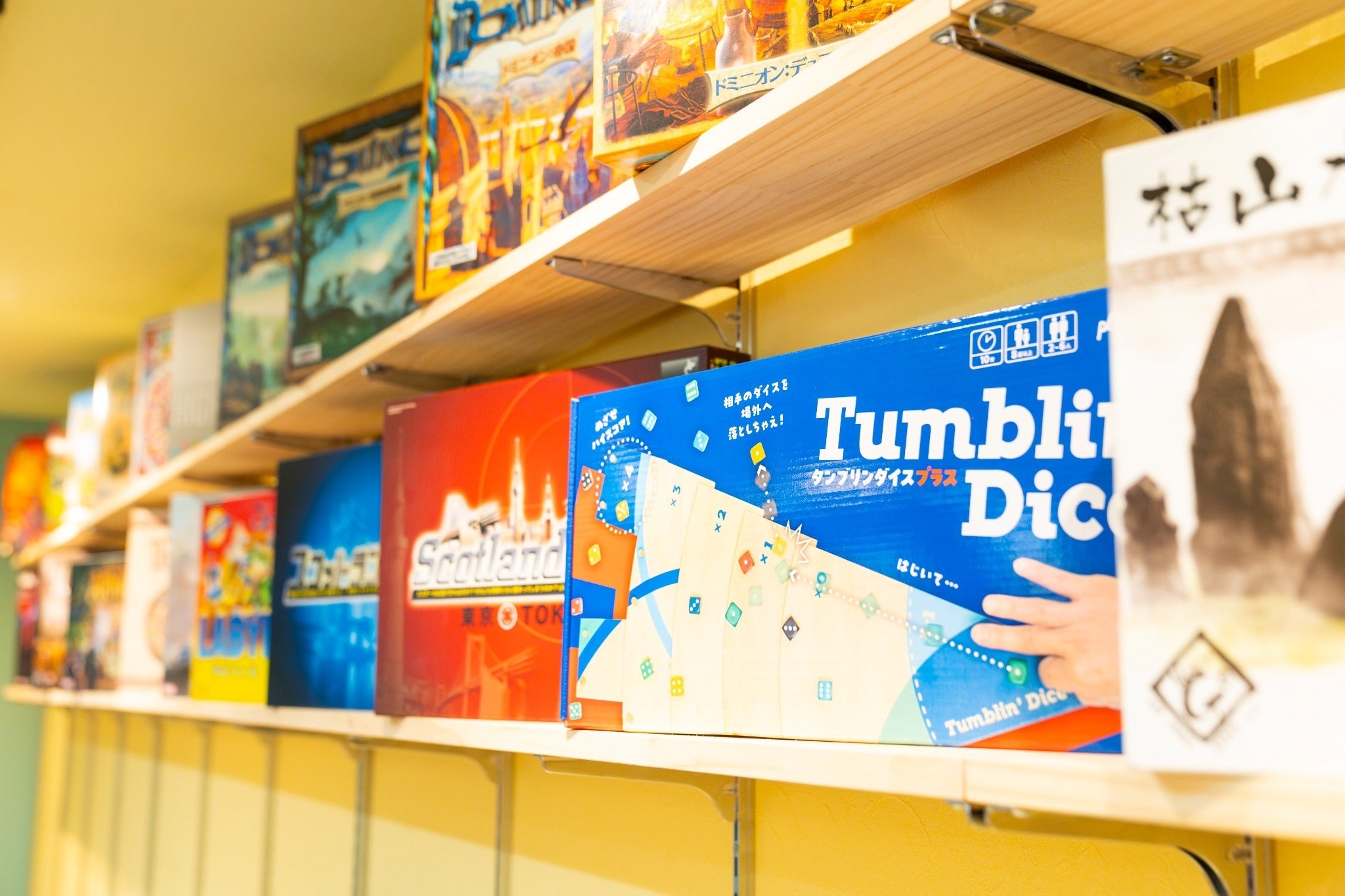 そして、たくさんのボードゲームが並ぶ棚の写真も撮影していただきました。