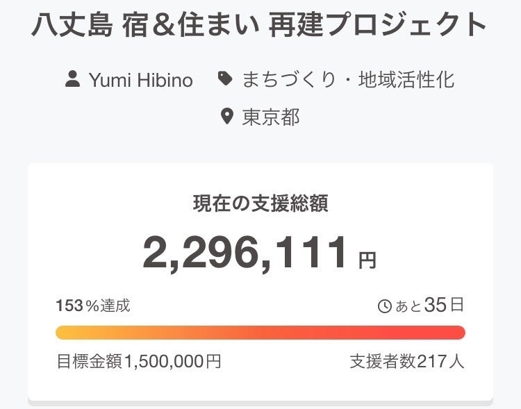 現在は153%達成の「2,296,111円」、支援者数は217名となっております。