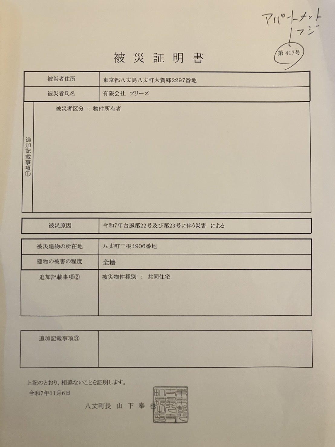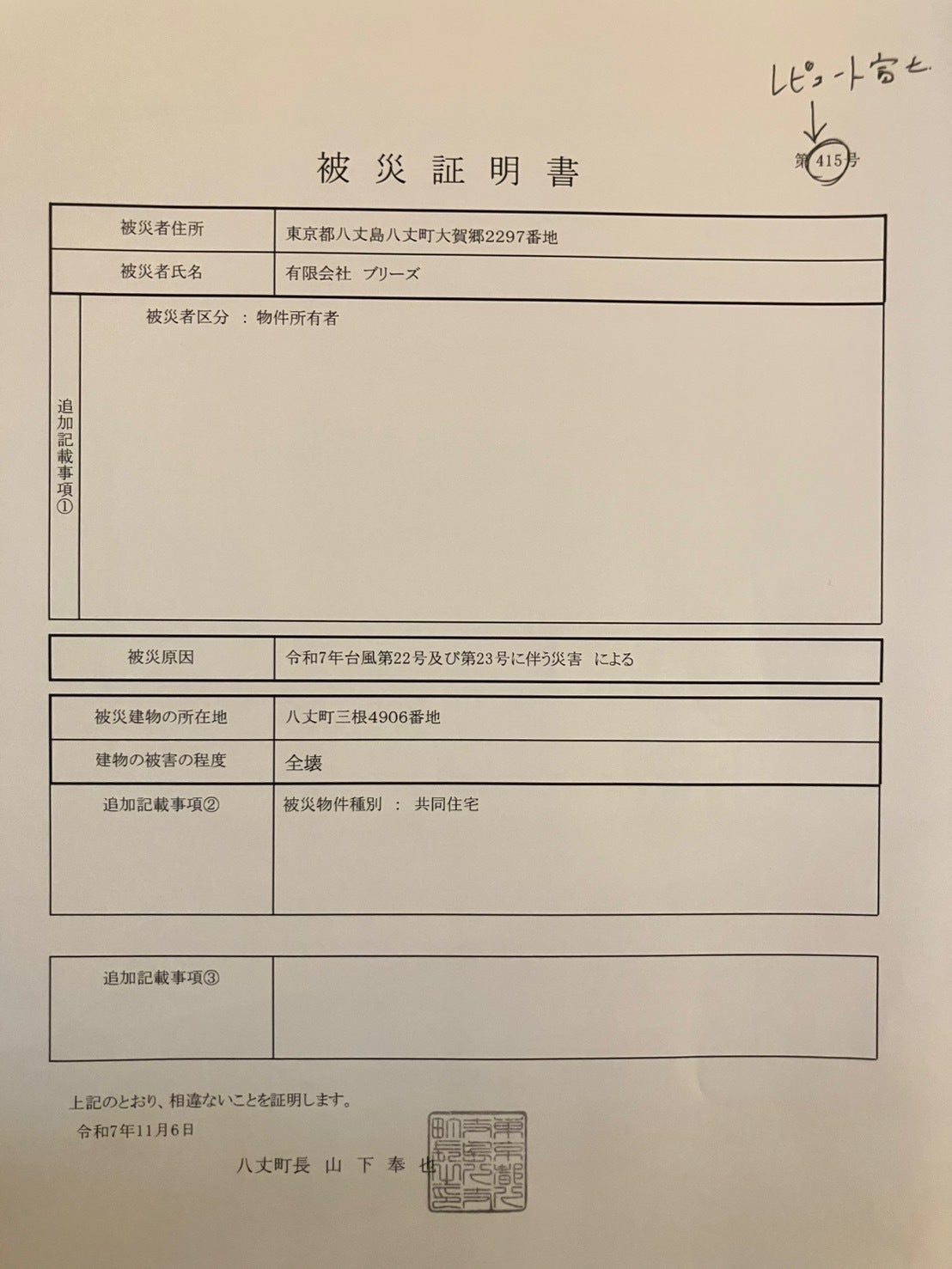 まず、レピュート富士とアパートメント富士の2棟について、それぞれの被災証明書が発行されました。