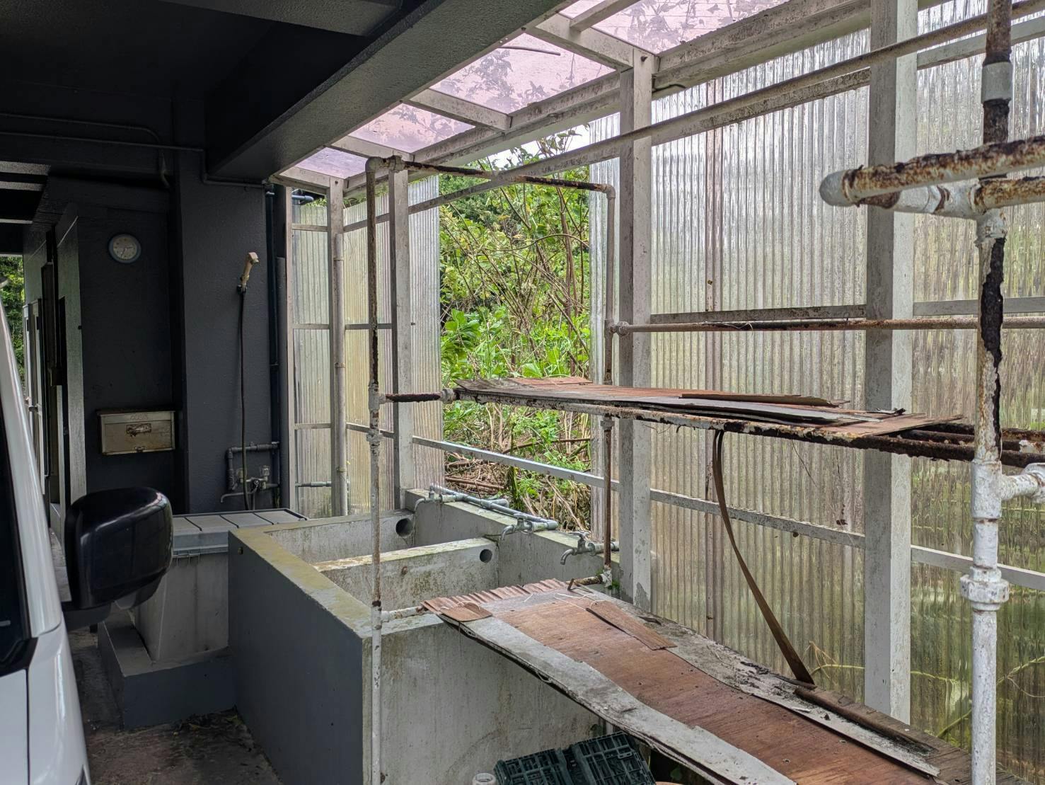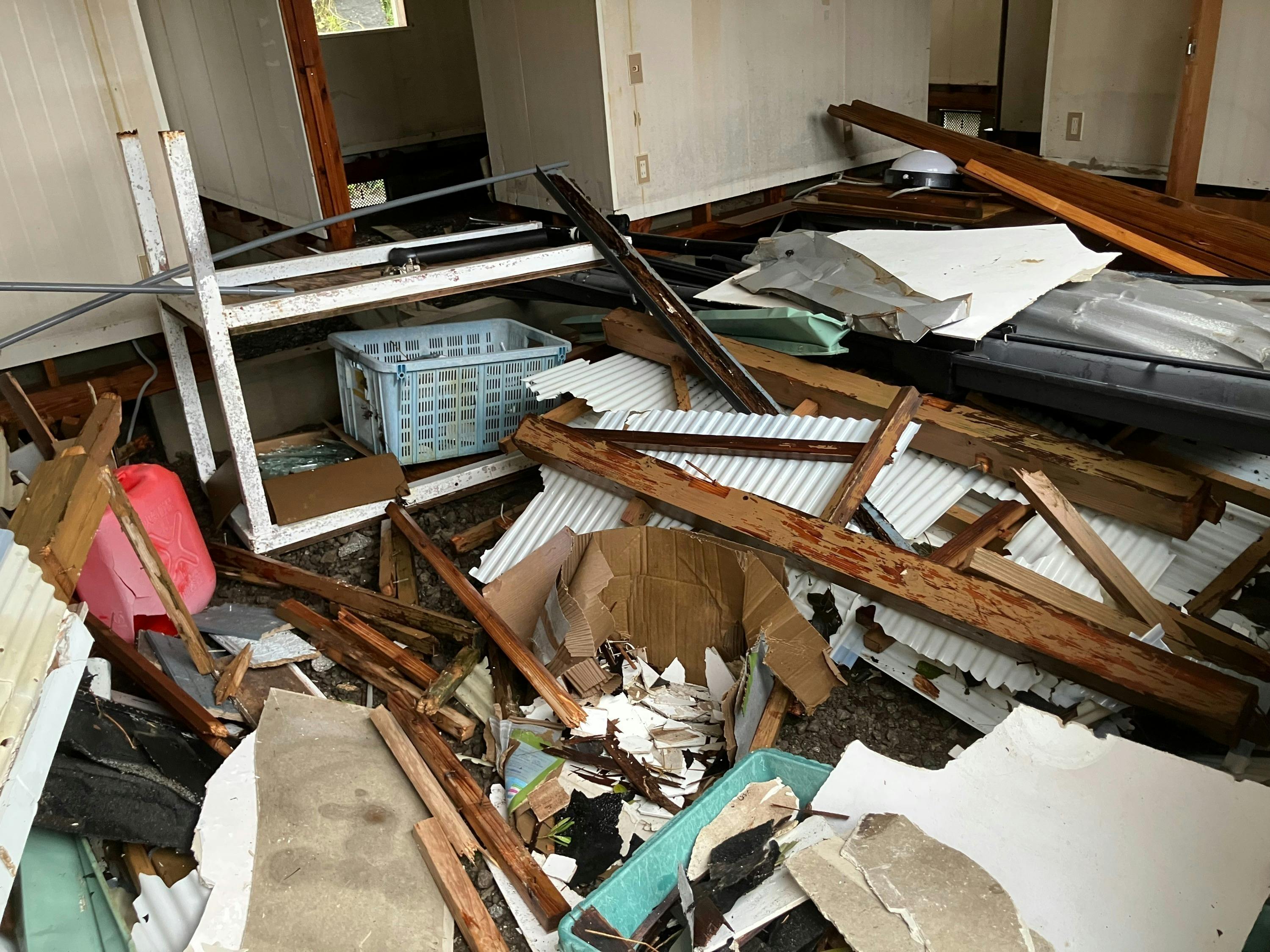 ケンチャルマ(宿本館):事務所部分で雨漏り・トイ(雨樋)の破損・外構一部損壊。倉庫の屋根営業継続はしているが、修繕が必要。