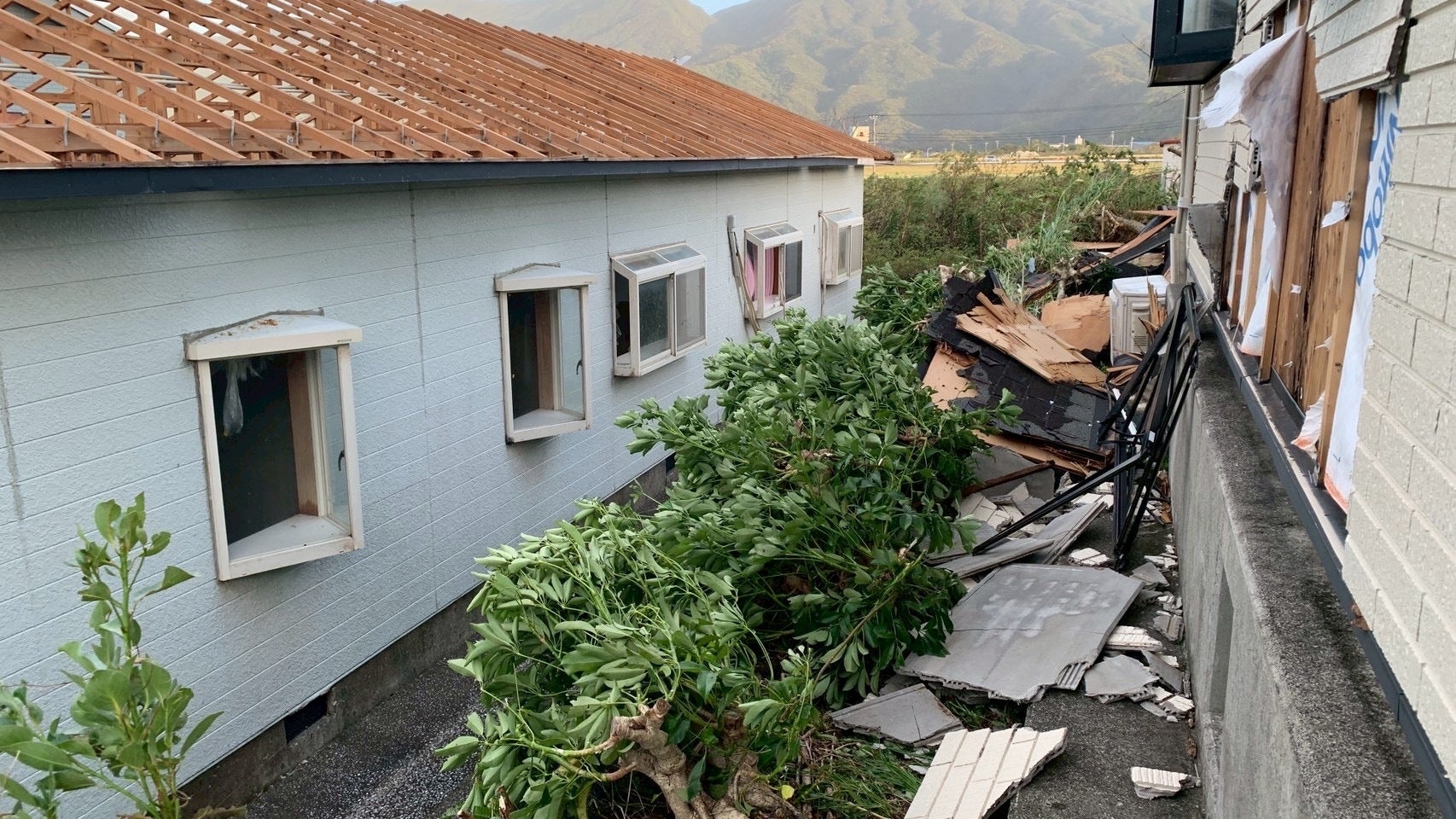 レピュート富士(2階建てアパート):屋根が半壊。2階部分は屋根がなく、雨漏りや天井崩落。全住民が避難中。