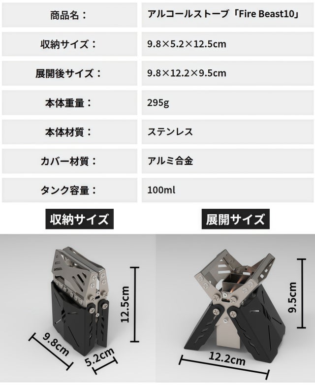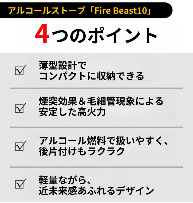 コンパクトに収納でき、追加パーツ不要ですぐ使える、しかも高火力、そんな新感覚アルコールストーブ「Fire Beast10」が誕生しました。
