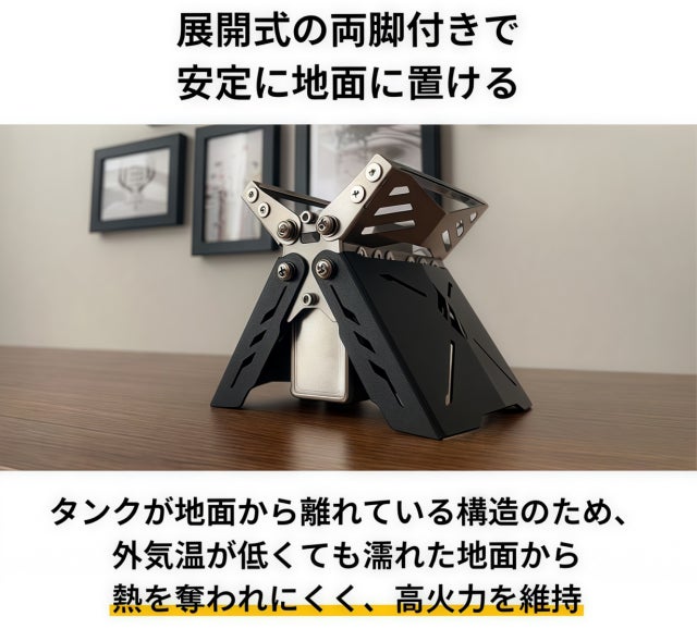 本体に備え付けられた2本の脚は展開式構造で、広げるだけでしっかりと地面に設置でき、安定性が格段に向上します。