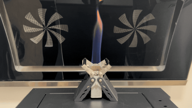 以下のGIFでは、左が銅管1本のみを使用した試作機の燃焼の様子、中央が煙突効果を取り入れた試作機の燃焼の様子です。