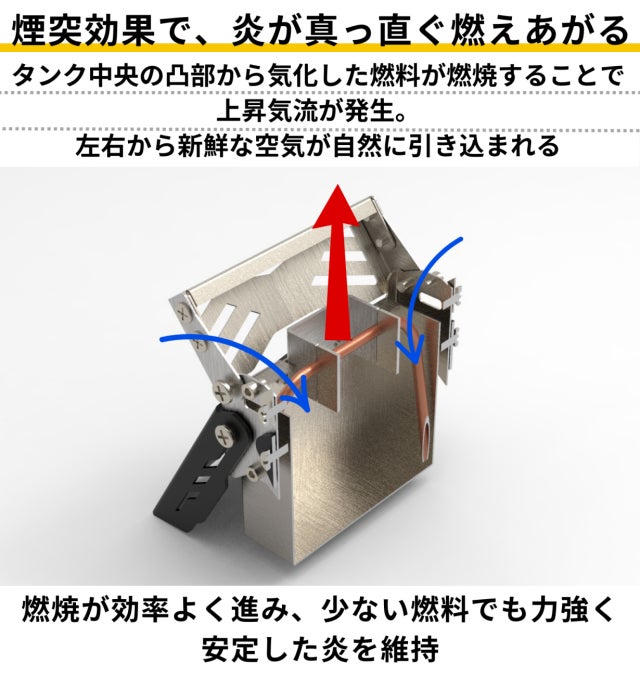 試行錯誤の末、最終的に「煙突効果による高火力」と「毛細管現象による火力の安定性」という2つの特徴を両立させる構造にたどり着き、本製品が誕生しました。