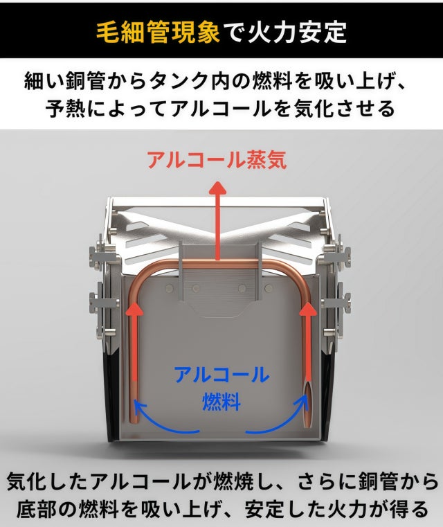 アルコールストーブ「Fire Beast10」では、燃焼タンク内部に固定された一本の細い銅管が、毛細管現象を利用して、アルコールを底部から上部へ吸い上げ、効率的に燃料を供給します。