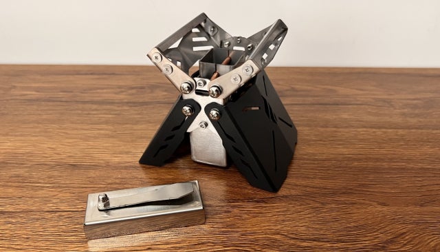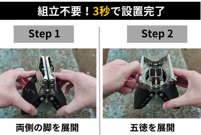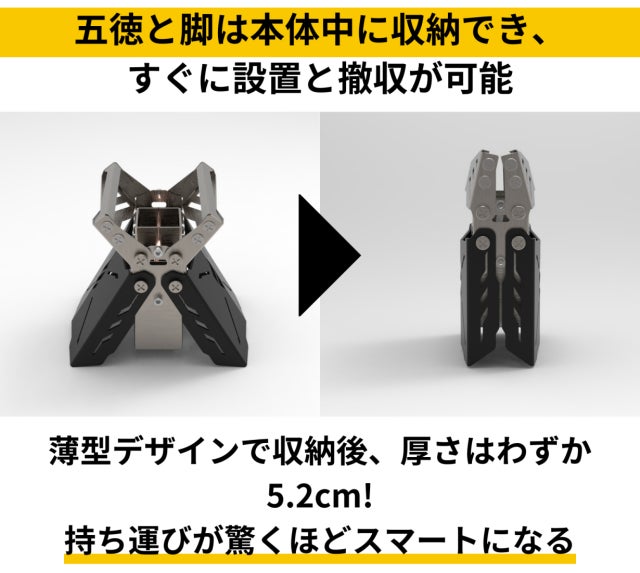 A:一体型で組み立てが不要な構造になっております。さらに、展開式の脚と五徳を本体に収納可能な薄型構造で、持ち運びもスムーズ。キャンプギアの荷物をできるだけ減らしたい方に最適です。