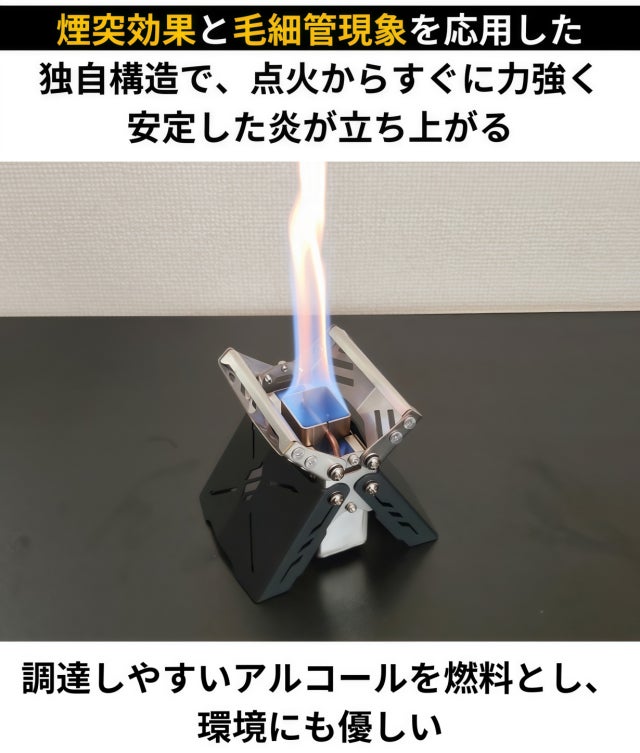 試行錯誤の末、最終的に「煙突効果による高火力」と「毛細管現象による火力の安定性」という2つの特徴を両立させる構造にたどり着き、本製品が誕生しました。