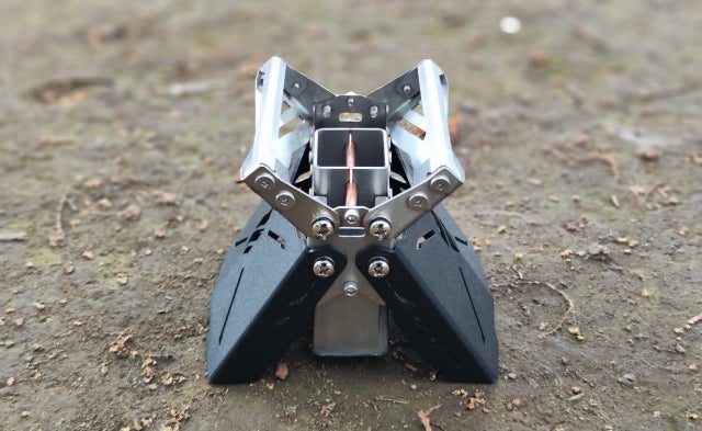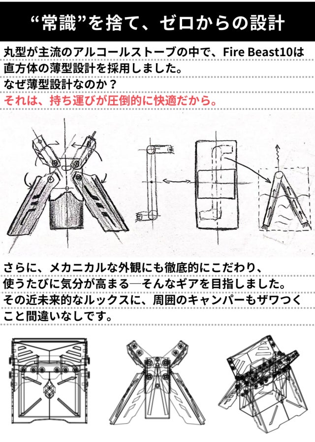 アルコールストーブ「Fire Beast10」は従来の丸形ではなく、直方体の薄型デザインを採用。