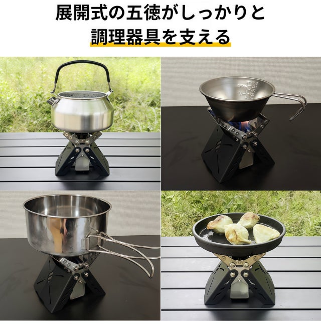 五徳自体が風防の役割も果たし、風の影響を抑えて効率的に調理が可能です。