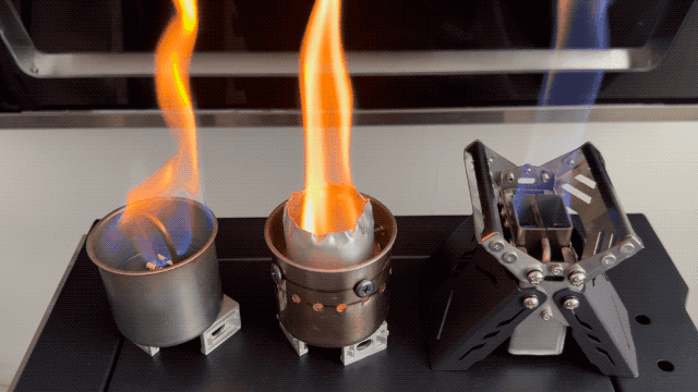 以下のGIFでは、左が銅管1本のみを使用した試作機の燃焼の様子、中央が煙突効果を取り入れた試作機の燃焼の様子です。