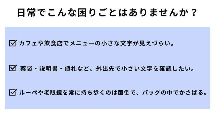 必要な瞬間にサッと取り出して、新聞やメニュー、薬袋の小さな文字を即チェック。Podケースやキーホルダーで持ち歩きもラク、失くす心配も少ない。まるでポケットに忍ばせた頼れる視覚アシスタントのようにあなたの外出をスマートにサポートします。