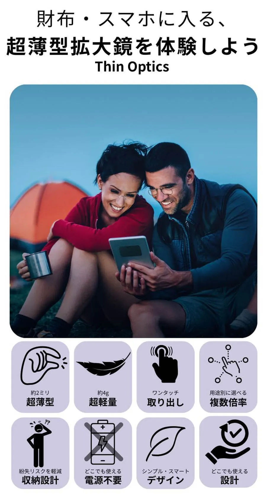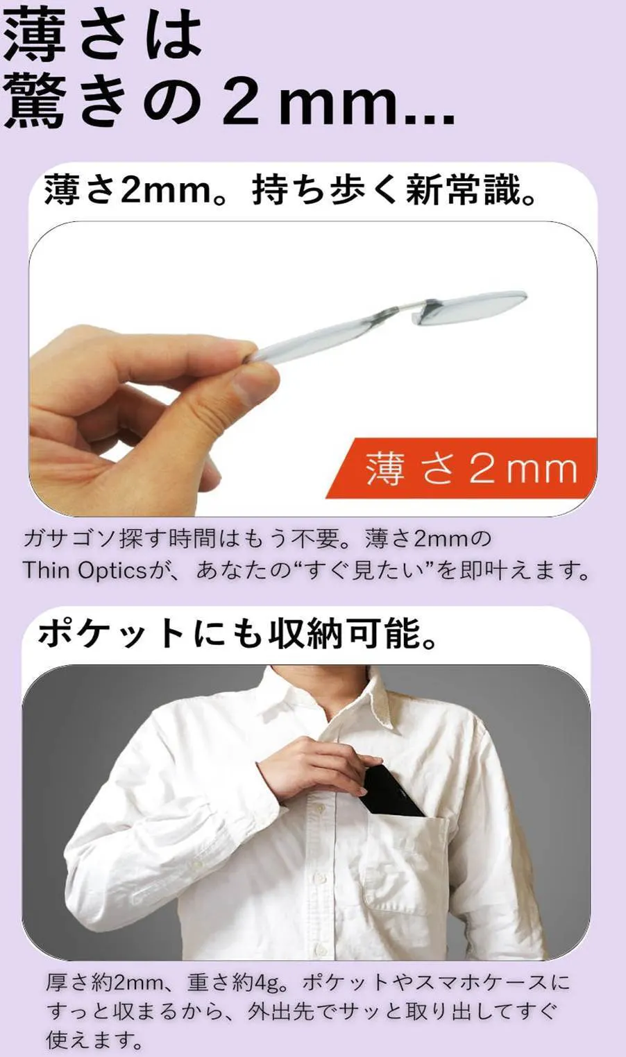 もう重たい持ち歩きは終わり!Thin Opticsは厚さ約2mm・重さ約4gの超薄・超軽量設計で、スマホや財布、ポケットの中に自然に溶け込みます。かさばる道具を探す手間は不要、取り出す手間も最小限。手に取った瞬間に視界がクリアになり、細かい文字をすっと確認できる安心感。軽さを感じさせないスマートさで、日常の持ち歩きを根本から変える、新しい常備習慣です。