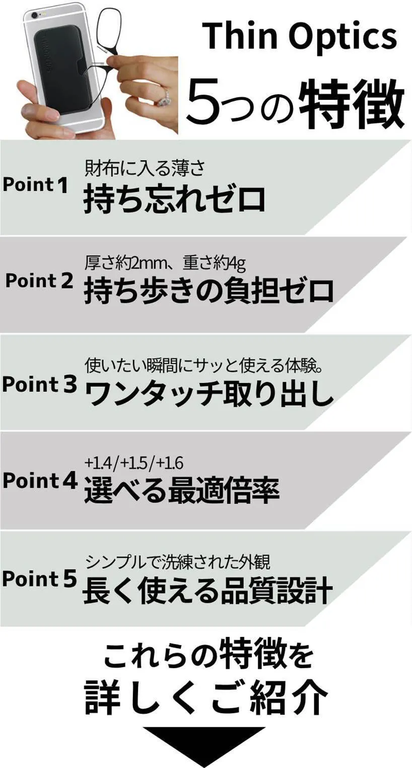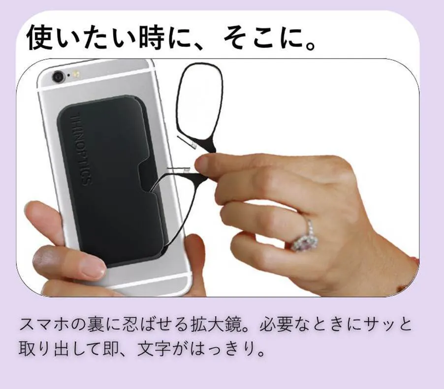 私たちはこの「外出先での小さな文字の困りごと」を、常備できる薄さとスマートな収納で解決するためにThin Opticsを提供します。