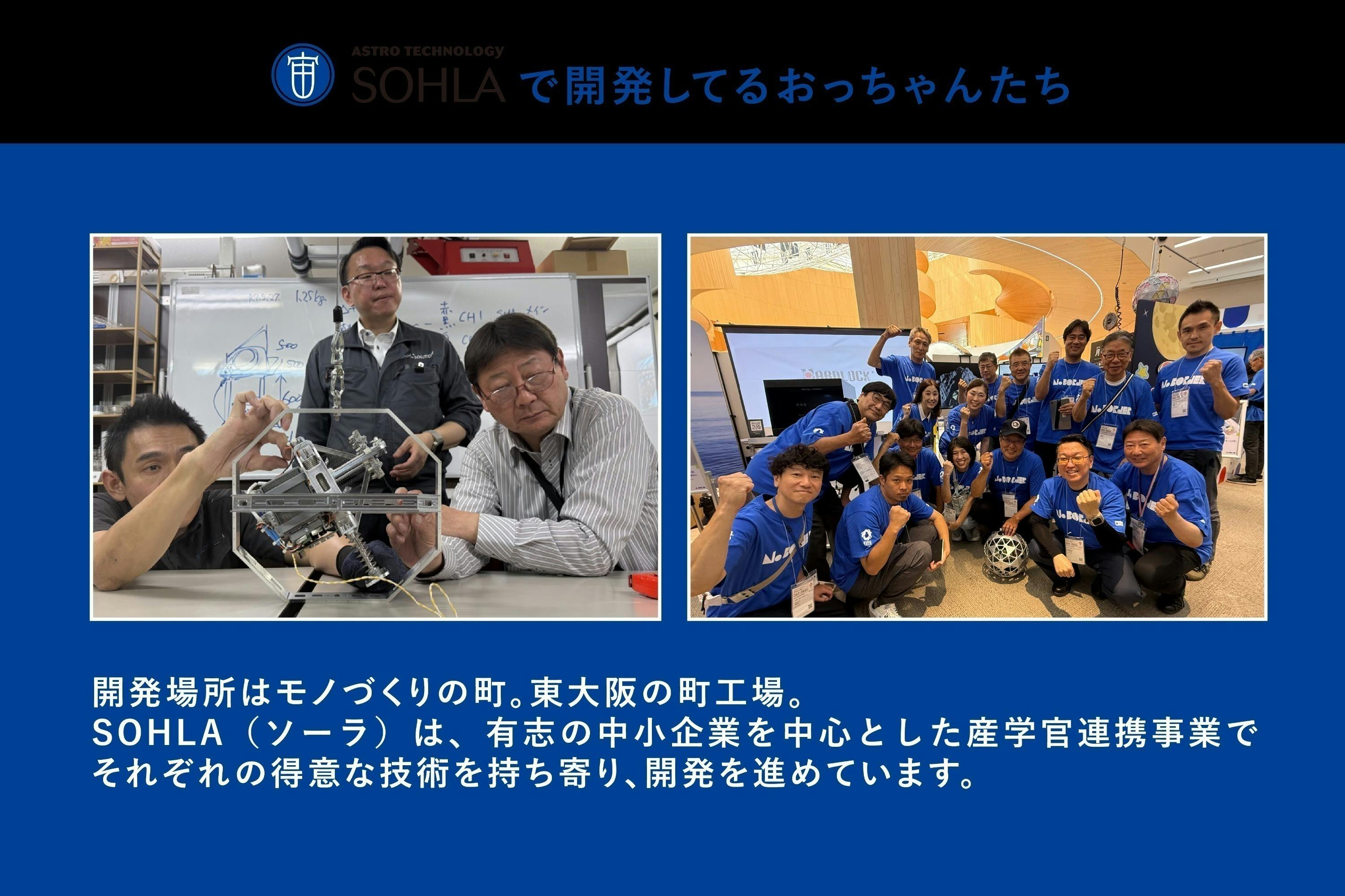 宇宙開発協同組合SOHLAと申します。私たちは2002年に設立以来、中小企業の技術力を結集し、宇宙という壮大な舞台に挑戦し続けてきました。2009年の小型人工衛星【まいど1号】の打ち上げ成功から16年、今度は月面跳躍移動ロボット【まいど2号】の開発に取り組んでいます。