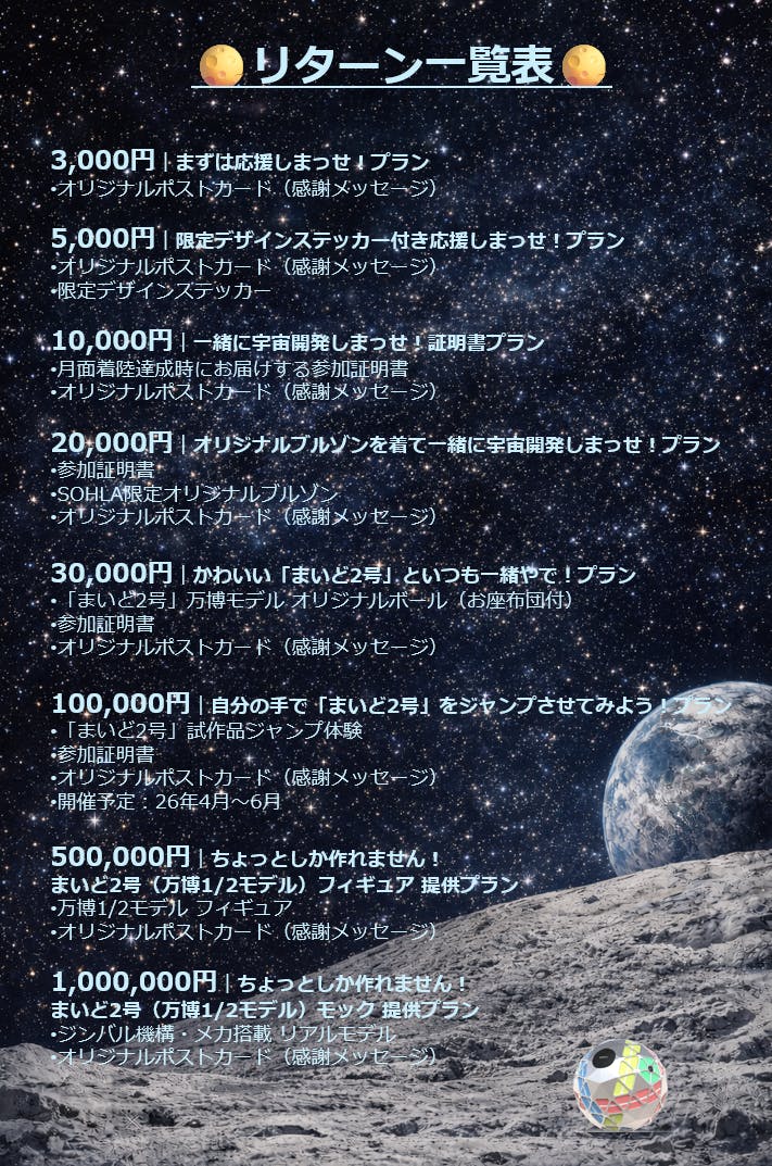 支援していただいた皆様には、一緒に宇宙開発をしている事が証明される証明書付プランや、オリジナルグッズ、実際にデモ機をジャンプさせることが出来る体験イベントや、数量限定の貴重なモックご提供など、様々なプランをご用意いたしました。