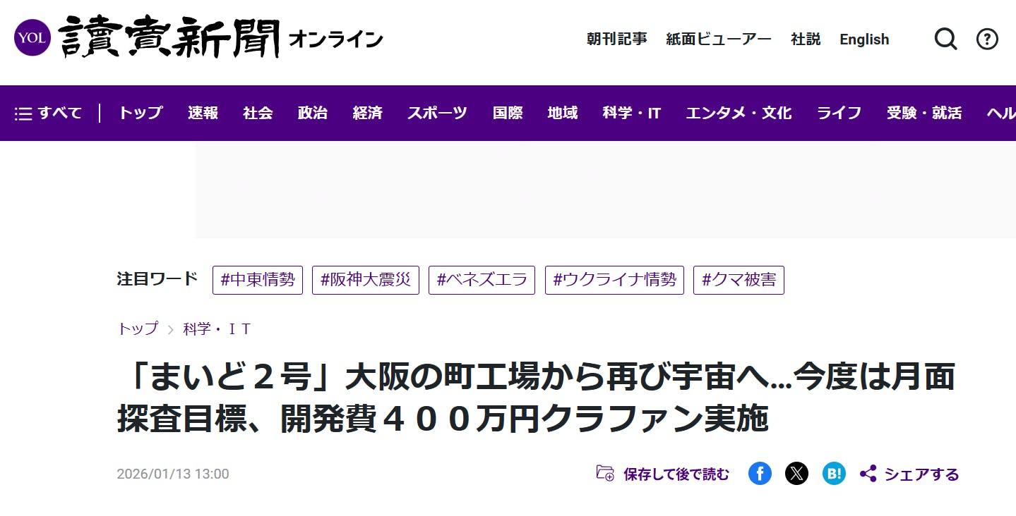 2026/01/14 13:09【メディア掲載】1月13日(火)、読売新聞さんの夕刊に掲載してもらいました!https://www.yomiuri.co.jp/science/20260113-GYT1T00111/今月末でクラウドファンディング第一弾は終了しますが、まだまだ応援していただきたいです!ラストスパート!頑張って開発していきますんでよろしくお願いいたします☆彡 もっと見る