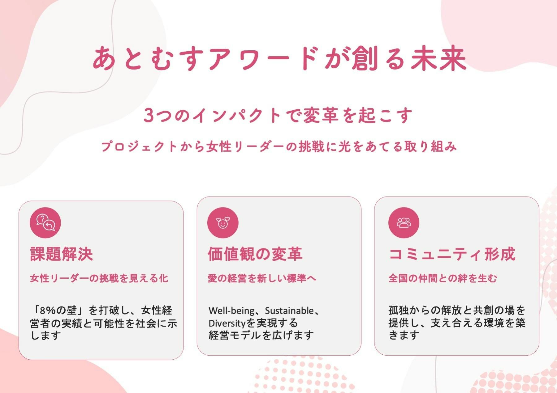 本プロジェクトは、家業を継ぐ女性たちが体現する「愛の経営」を讃える、日本初の「あとむすアワード」の立ち上げを目的としています。