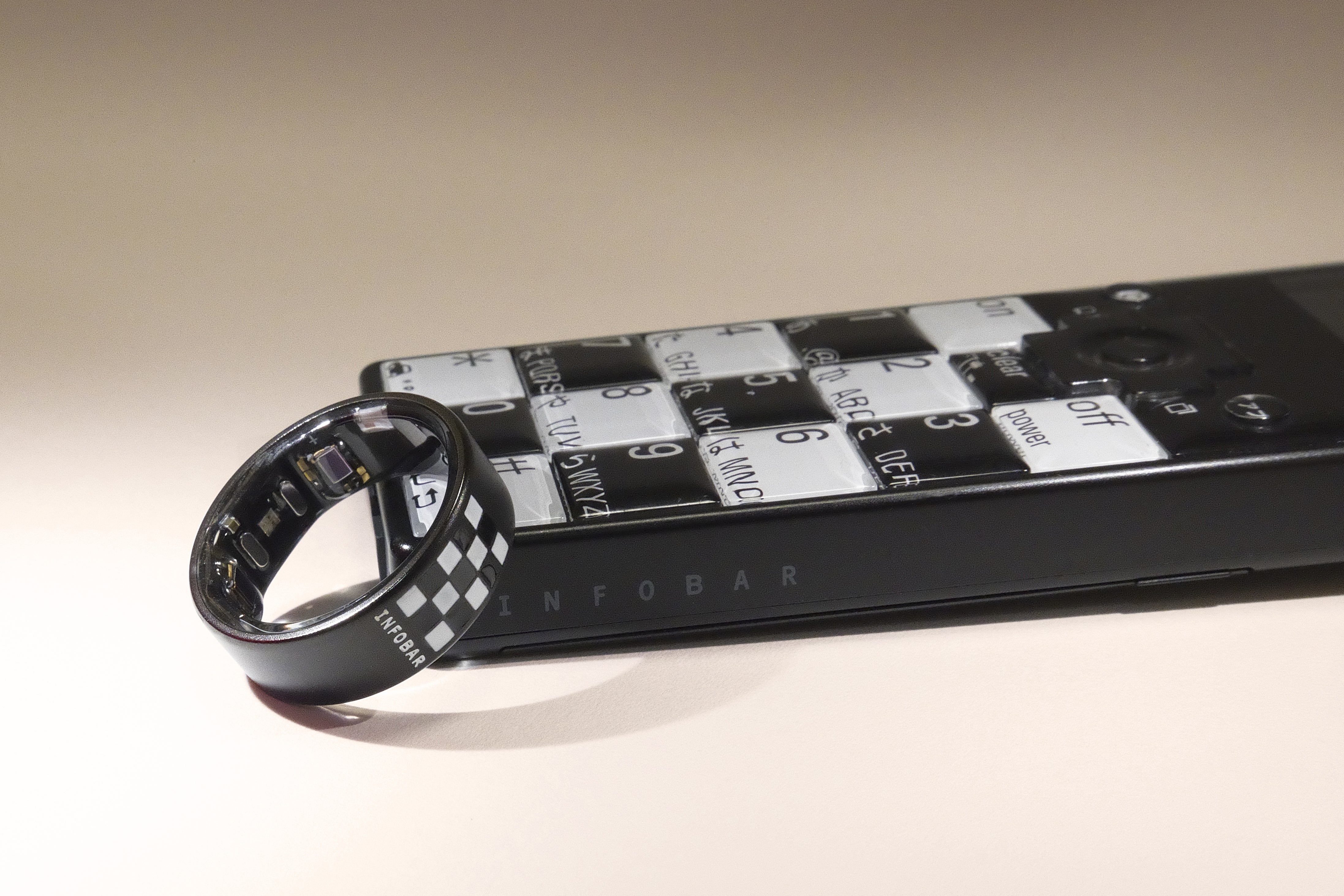 INFOBARはau Design projectの第一弾モデルとして今から22年前の2003年10月31日に販売されました。そもそものコンセプトは「ファッションとしての価値を持つ携帯電話」。機能的価値を超えて、身につけることで心華やくような情緒的価値を備えたケータイを目指していました。指輪もファッションアイテムの一つ。スマートリカバリーリングとのコラボも必然だったのかもしれません。
