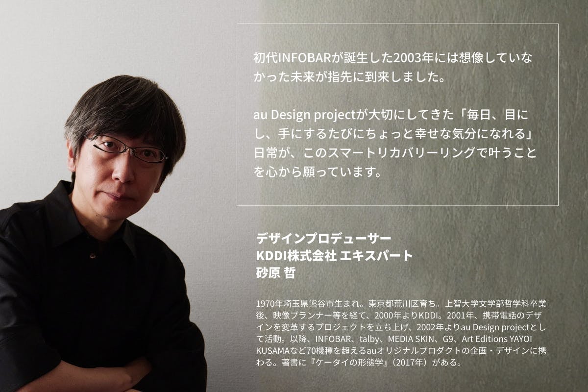 INFOBARはau Design projectの第一弾モデルとして今から22年前の2003年10月31日に販売されました。そもそものコンセプトは「ファッションとしての価値を持つ携帯電話」。機能的価値を超えて、身につけることで心華やくような情緒的価値を備えたケータイを目指していました。指輪もファッションアイテムの一つ。スマートリカバリーリングとのコラボも必然だったのかもしれません。