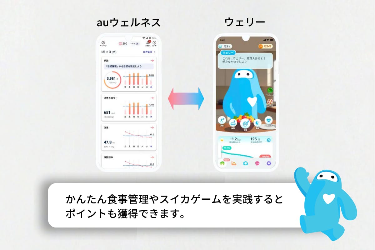 さらに、ウェリーアプリは、auウェルネスとも連携。かんたん食事管理や、スイカゲーム -エクササイズ版などをチャレンジすると、ポイントを獲得できるチャンスも。