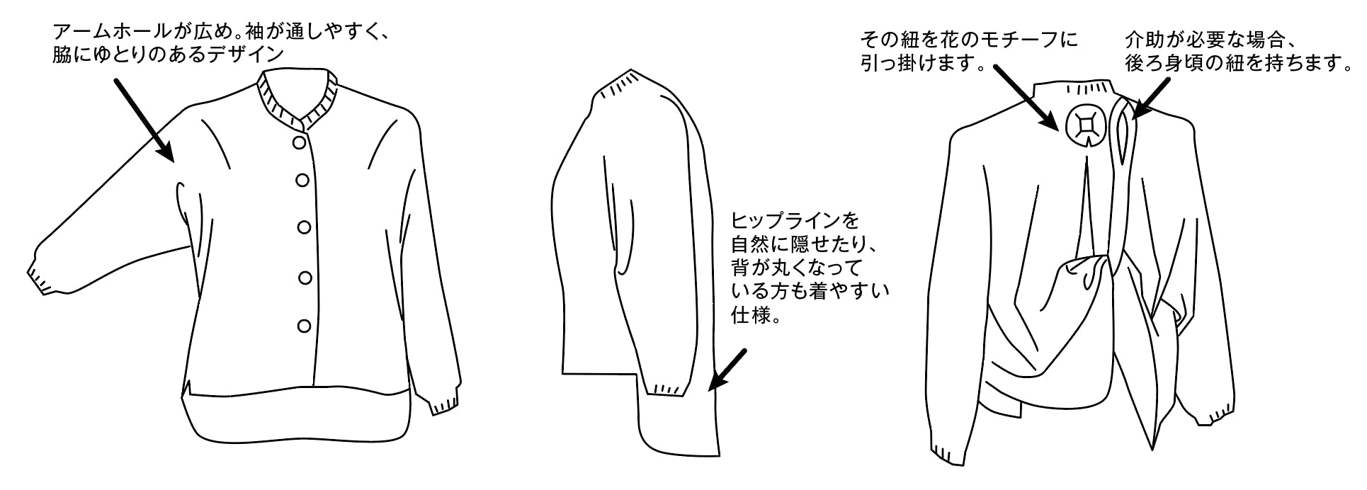 「あいのふく」は、アームホールを広めに設計し、脇周りに余白をもたせています。服に合わせて体を〈頑張らせる〉のではなく、〈身体に馴染む感覚〉を大切にしています。