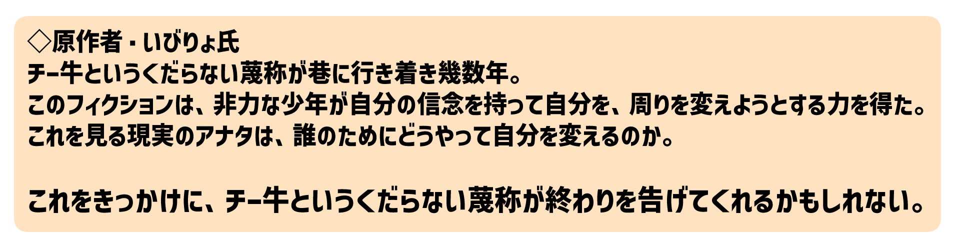 チー牛というくだらない蔑称が巷に行き着き幾数年。このフィクションは、非力な少年が自分の信念を持って自分を、周りを変えようとする力を得た。これを見る現実のアナタは、誰のためにどうやって自分を変えるのか。