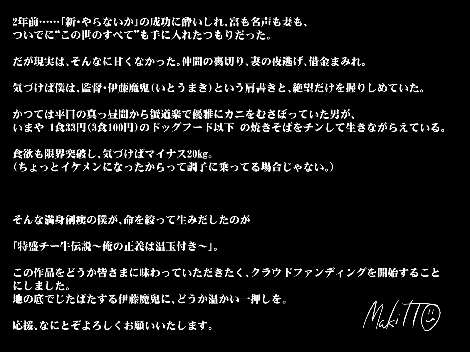 小説版に続く形で、「チー牛=ネガティブ」のイメージを覆す痛快で熱いヒーローアニメを、全国のファンに届けたい。そのために、クラウドファンディングの力をお借りしたいと思っています。