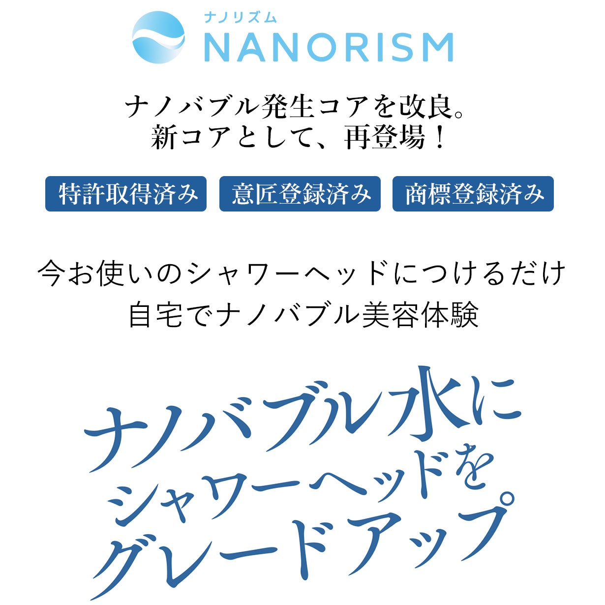 "NANORISM"とは、「ナノバブル」×「生活を豊かにするアイテム」というコンセプトのもと、2つの潤い(水で潤う・生活が潤う)をご提供したい想いが込められております。