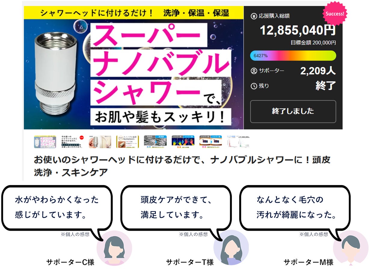 今回のプロジェクトは、特許取得済み・意匠登録済みのナノバブル発生コアを使用した日本製「ナノバブルアダプター」です。すべての部品は国内産、企画・デザイン・商品化まですべて日本の会社が日本国内で実施しております。水の性質は肉眼では見えませんが、第三者機関による各種テストに時間と費用をかけ、試行錯誤を繰り返し、ようやく完成した製品をぜひ皆様にご体感頂けますと嬉しいです。