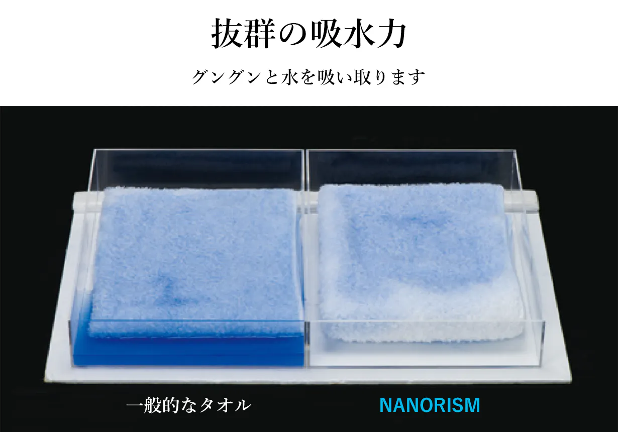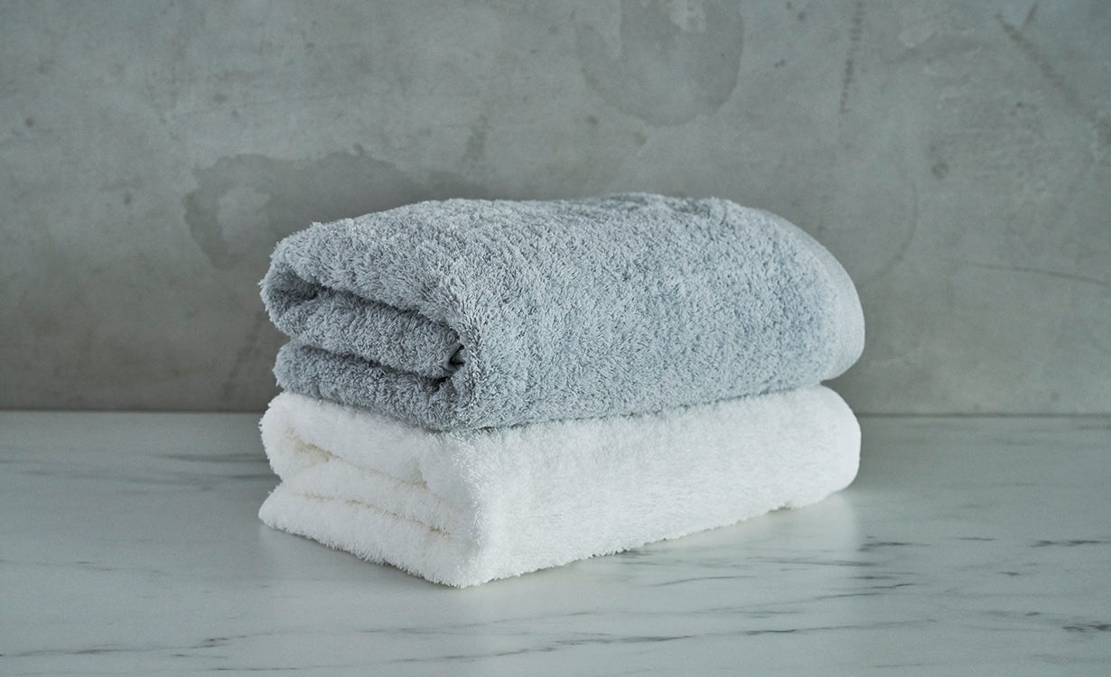 たっぷりの空気を含ませながら、微細な加減で創られた糸。高級ホテルで使うふわふわなタオルを想わせる、他とは違う肌触り・優れた吸水力・速乾力・耐久力を誇ります。