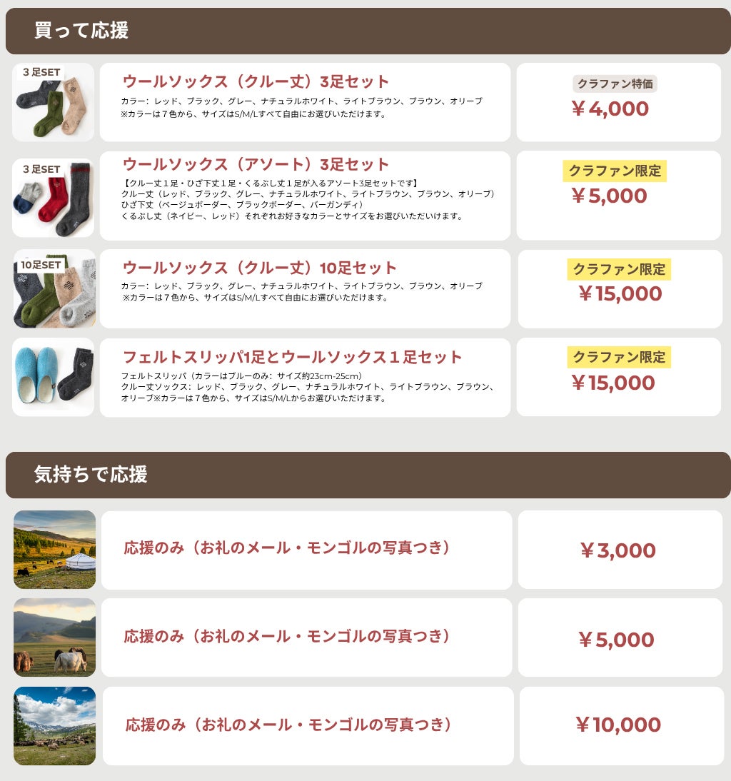 2025/11/28 20:49ふとプロジェクトを確認すると…なんと支援総額819,000円!あと約18万円で目標達成です!こんなにたくさんの人に応援していただけて、本当に感謝しています。目標が高すぎたかなぁ…なんて弱気になる日もありましたが、これまでの支援してくださった方の数、コメントで暖かいメッセージをくださった方々、直接応援の声をかけてくださった方々、まだ迷っているけどこれからするね!と言ってくれた方の期待をちょっぴり抱きつつ、、、あと2日最後まで走り抜けたいと思います!クラウドファンディングの支援は11/30 23:59までとなっております。現在、千葉県ペリエ海浜幕張にて催事出展もしております。「毎年楽しみにしているのよ!今年も来てくれてありがとう!」「来年もこの場所で催事やってね!」なんてうれしいお言葉をいただき、嬉しい気持ちをかみしめながら。そんな毎年楽しみにしてくださっている方々のためにも!このプロジェクトを成功させたいのです!!皆様にもっとモンゴル産ウール靴下の良さが伝わりますように!最後の最後まで応援、どうぞよろしくお願い致します!!! もっと見る