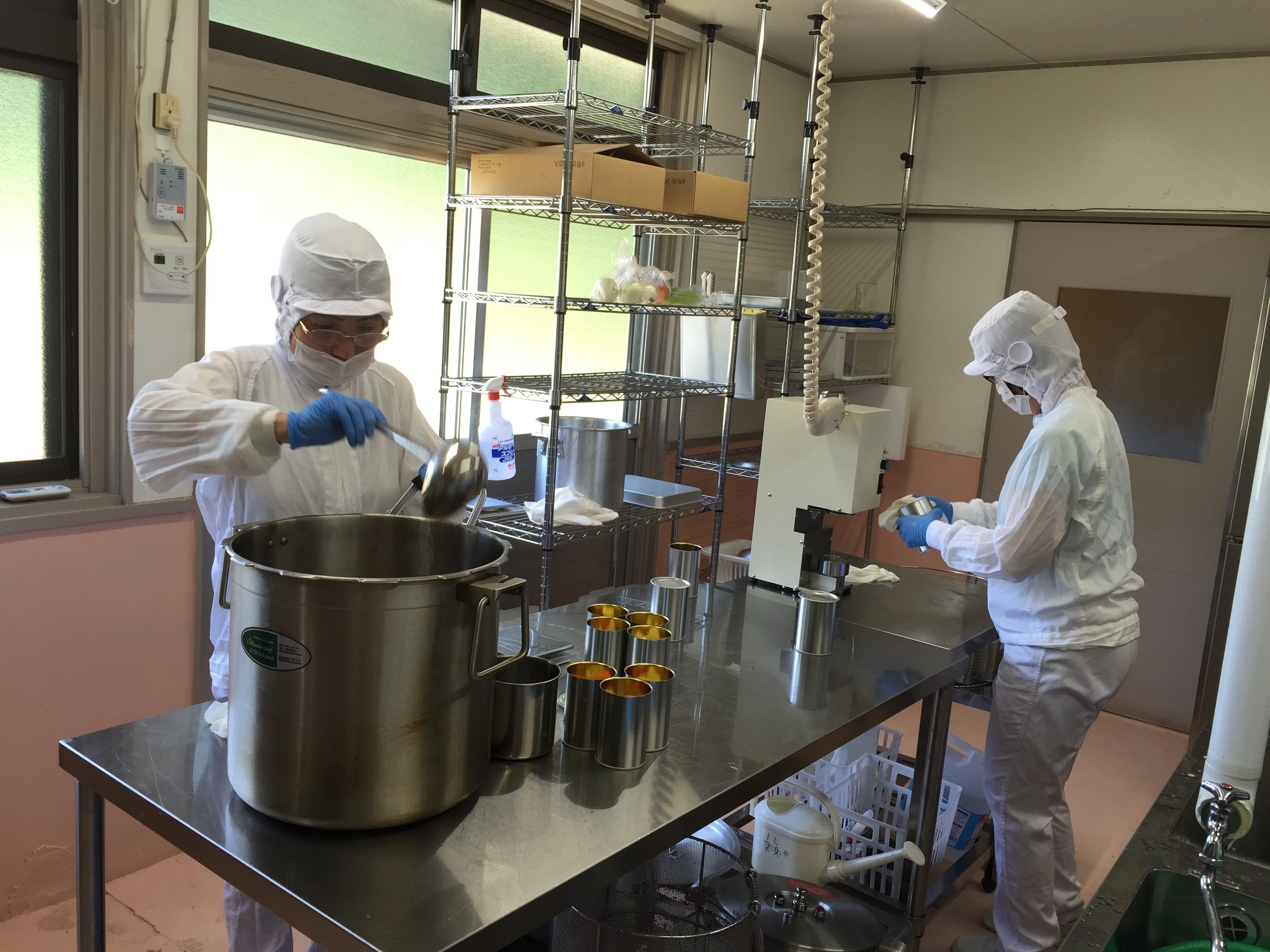 今回のエゾシカビリヤニでも、前回のイノシシビリヤニ同様に、ベースとなる肉は缶詰になっています。小さな小さな厨房で、エゾシカ肉を香味野菜とトマトでじっくり煮込み、家内制手工業よろしくひと缶ずつ手作業で充填し、巻締(缶に蓋を乗せて密封すること)をしています。大きな食品工場なら、ラインに並べられた空き缶にチューブから流し込むところを、大鍋からレードルで一杯ずつすくって入れているんです。