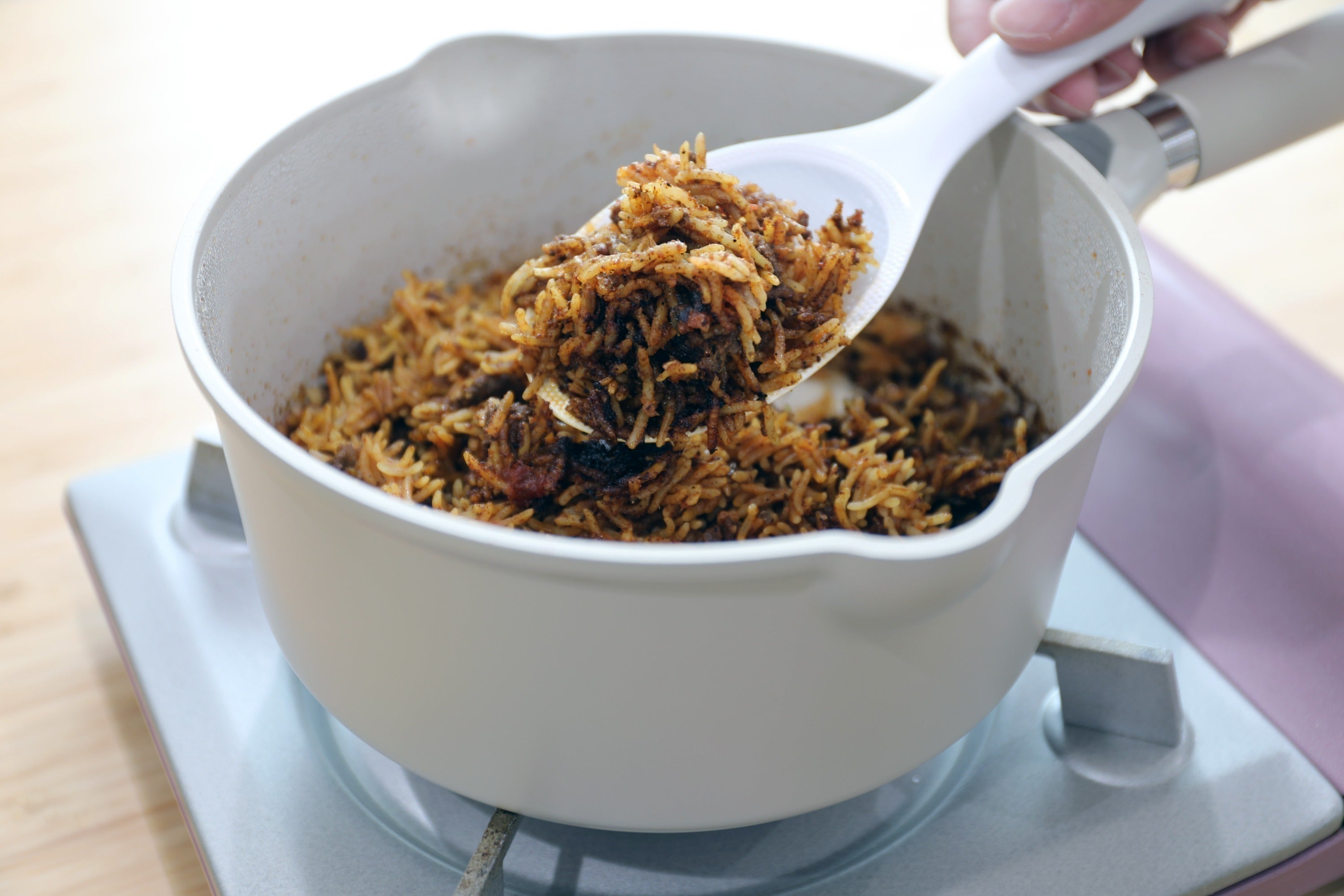 前回のイノシシビリヤニでは、炊飯器で簡単に作れる手軽さを重視しました。ただ「スパイスの香りが炊飯器に残る」という声もありました。そこで今回は、炊飯器はもちろんですが、家庭の鍋でも簡単に作れるようにレシピを最適化しています。