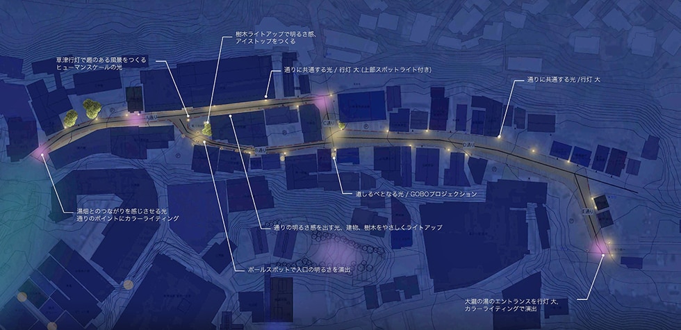 草津温泉の街並みは、湯畑を中心に土産物店や温泉旅館が連なり街並が形成されています。本事業では、湯川駐車場から大滝乃湯、更には湯畑へと続く湯路の整備を行います。木造建物が連なる街並をライトアップすると共に行灯の設置、これに加え、路面には遊び心を取り入れたアクセントとして9本→3本→2本(くさつ)のタイル舗装を行います。また、裏草津地蔵から大滝乃湯へと続く湯路においては、犬矢来(いぬやらい)の設置を行い、足元の雑然さを隠しつつ情緒あふれる景色を演出します。