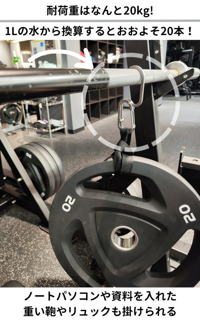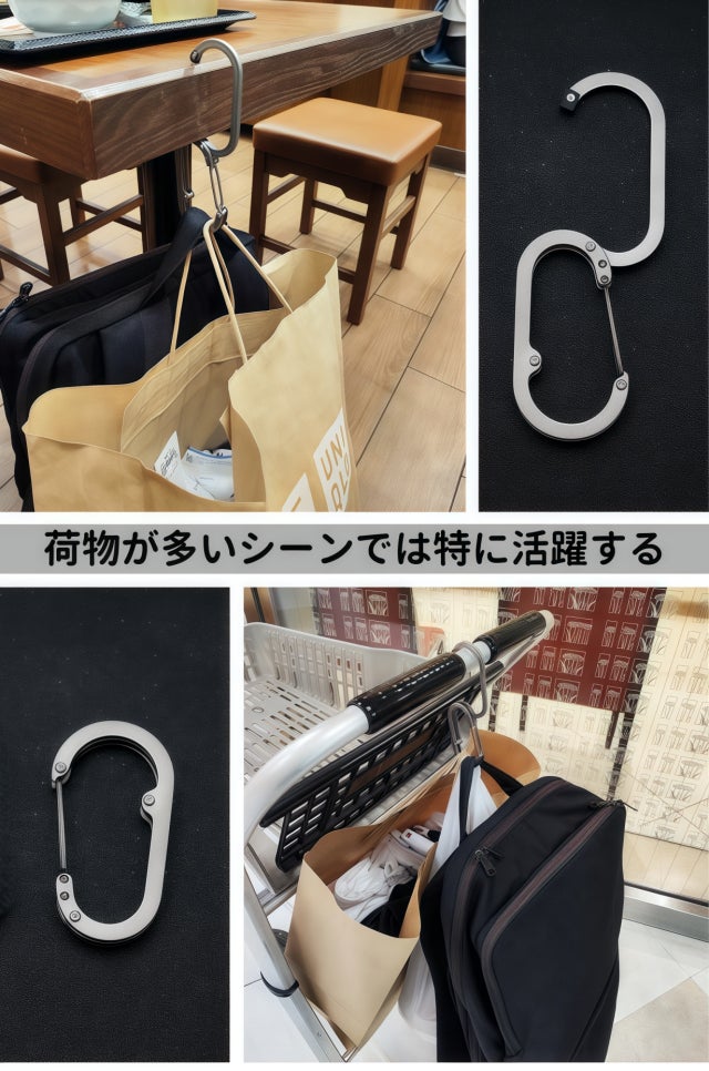 チタン製で強度が高く、自分の荷物だけでなく、家族や友人の荷物も一緒にかけられます。