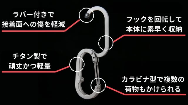 出先で荷物を簡単に机に掛けられ、長く使い続けられるチタン素材を使用し、普段の生活で大活躍すること間違いなし!