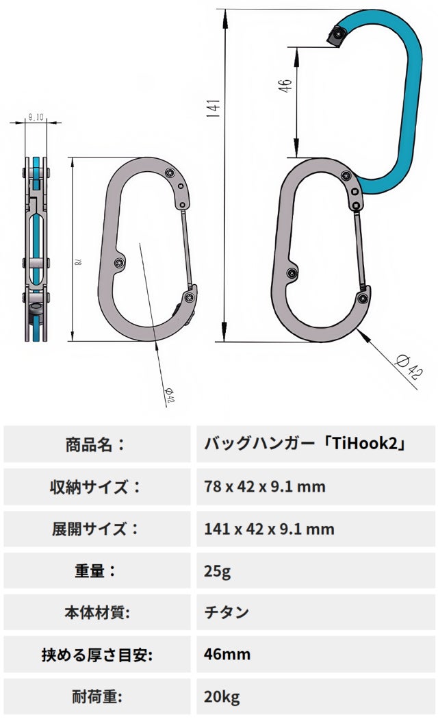 チタン製カラビナ型バッグハンガー「TiHook2」は使いやすさを重視し、細部にまでこだわりが詰まっています。