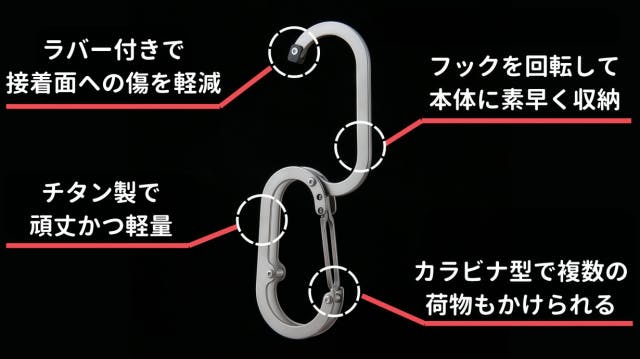 チタン製で強度が高く、自分の荷物だけでなく、家族や友人の荷物も一緒にかけられます。