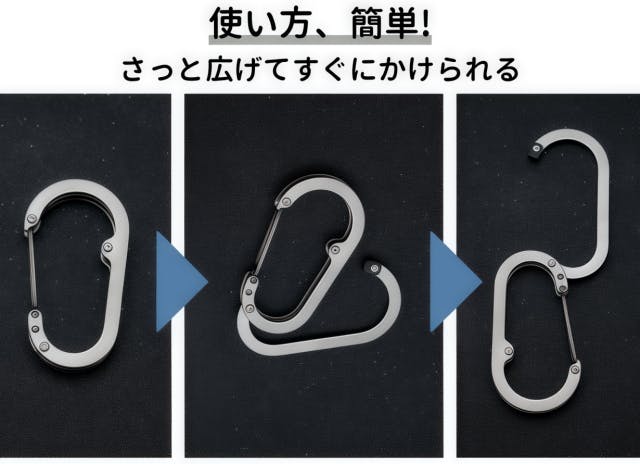 普段はカラビナとして使えますが、バッグハンガーが使いたい時には一瞬で変形し、テーブルや棚にすぐに引っ掛けて使える便利な2WAY仕様です。
